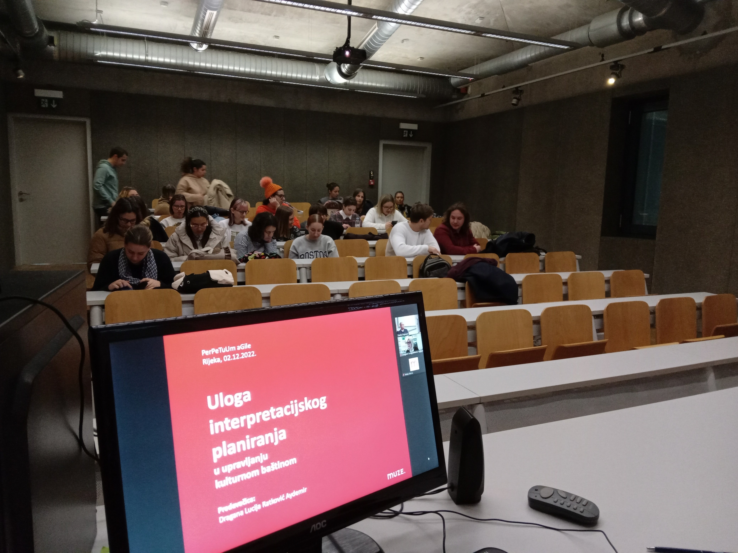 Gostujuće predavanje Interpretacijsko planiranje i njegova uloga u upravljanju kulturnom baštinom održala je Dragana Lucija Ratković Aydemir iz tvrtke MUZE, 2.12.2022. Gostujuće predavanje bilo je namijenjeno svim studentima prediplomskog i diplomskog studija povijesti umjetnosti i povijesti. U prvom dijelu predavanja predavačica je upoznala studente sa svojim radom i djelovanjem. Objasnila je na koji način u okviru svoga posla primjenjuje znanje stečeno formalnim i neformalnim obrazovanjem u privatnom sektoru. Objasnila je studentima pojam interpretacijskog planiranja, te koja je njegova uloga u upravljanju kulturnom baštinom. U drugom dijelu predavanja osobitu je pažnju posvetila upoznavanju studenata s vrijednostima kulturne baštine. Istaknula je kako upravo vrijednosti pojedinog lokaliteta, spomenika i slično utječu na politike upravljanja baštinom, od lokalne do nacionalne razine, i šire. U raspravi u koju su se aktivno uključili studenti zaključeno je kako je važno razmišljati izvan okvira te se tijekom studija uključiti u rad strukovnih udruženja za stjecanje kompetencija izvan službenih studijskih programa.