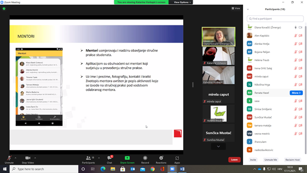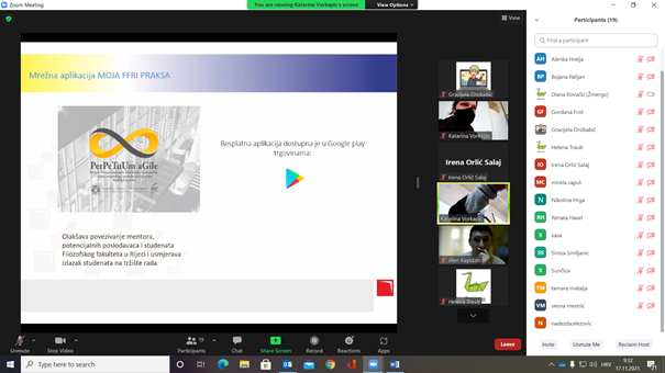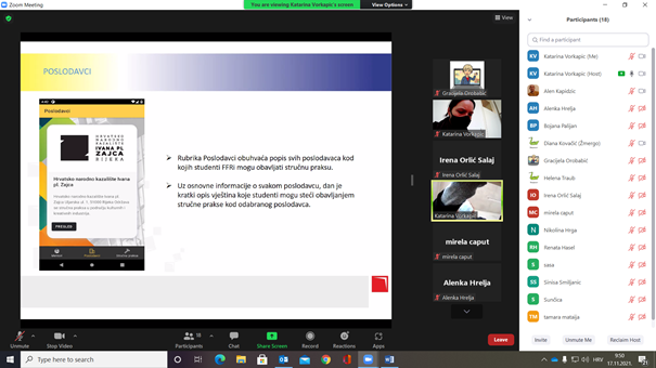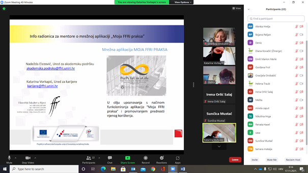 Info radionica za mentore o mrežnoj aplikaciji s ciljem upoznavanja s načinom funkcioniranja Moje FFRI prakse i promoviranjem prednosti njenog korištenja, održala se na Filozofskom fakultetu u Rijeci, Sveučilišna avenija 4 u srijedu 17. studenoga 2021.