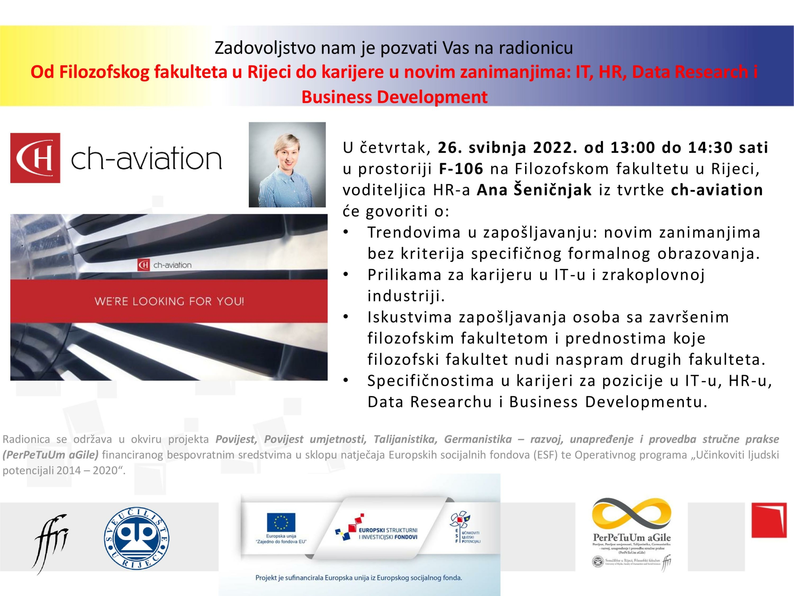 Kompanija ch-aviation je međunarodna kompanija koja ima ured i u Hrvatskoj i koja trenutno zapošljava veći broj novih zaposlenika na različitim pozicijama u IT-u, HR-u, Data Researchu i Business Developmentu te će spomenute mogućnosti predstaviti i studenticama i studentima zainteresiranima za karijeru u novim zanimanjima u kojima je jezik svakodnevne komunikacije engleski. Tako će gđa Ana Šeničnjak, voditeljica ljudskih resursa tvrtke ch-aviation, u četvrtak, 26. svibnja 2022. godine održati radionicu na temu Od Filozofskog fakulteta u Rijeci do karijere u novim zanimanjima: IT, HR, Data Research i Business Development, na kojoj će, među ostalim, govoriti o trendovima u zapošljavanju u novim zanimanjima te iskustvima zapošljavanja osoba sa završenim filozofskim fakultetom i prednostima koje filozofski fakultet nudi naspram drugih fakulteta. Radionica će se održati u prostoriji F-106 od 13:00 do 14:30 sati.