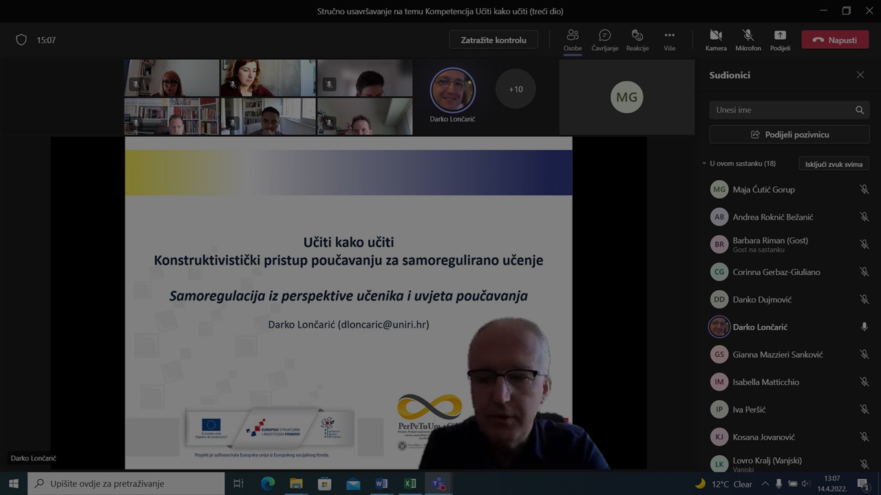 Trodnevna edukacija nastavnika germanistike, talijanistike, povijesti i povijesti umjetnosti na temu Kompetencija učiti kako učiti s ciljem konceptualnog razumijevanja sadržaja održana je online na platformi MS Teams 17. ožujka 2022. (1. dio), 7. travnja 2022. (2. dio) i 14. travnja 2022.(3. dio) – predavač: izv. prof. dr. sc. Darko Lončarić s Učiteljskoga fakulteta Sveučilišta u Rijeci, voditelj Laboratorija za učenje i poučavanje, stručnjak za samoregulirano učenje i samousmjereno obrazovanje koji su najuže vezani za kompetenciju Učiti kako učiti – generičku kompetenciju koja je jedna od ključnih u okviru cjeloživotnog obrazovanja. U fokusu planirane edukacije bilo je razumijevanje konceptualnog sadržaja uz primjenu konstruktivističkog pristupa u poučavanju koji se temelji na identifikaciji alternativnih koncepcija u stvaranju (problemskih) situacija koje će generirati kognitivne konflikte, a oni posljedično prekonceptualizirati dotadašnji (pogrešan) koncept.
